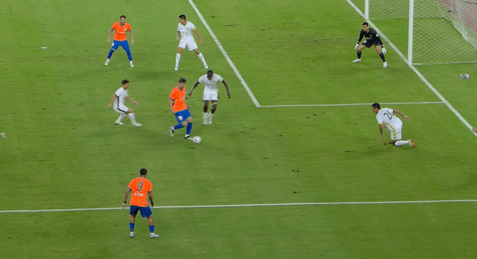 下半场回来,国安依旧占据控球上的主动,而泰山队前场的外援三叉戟,继续利用超强的个人能力威胁国安的防线。张玉宁禁区停球、射门一气呵成,但是准星不佳。第61分钟,高准翼插上,谢文能起脚推射,稍稍偏出远端立柱!随后,卡扎伊什维利晃过门将,面对空门却击中立柱弹出!仅仅一分钟后,泰山队角球罚到禁区,克雷桑传到后点,高准翼头球摆渡,中路的马德鲁加凌空卧射破门,5:0!